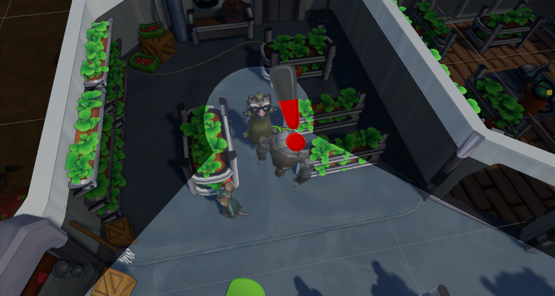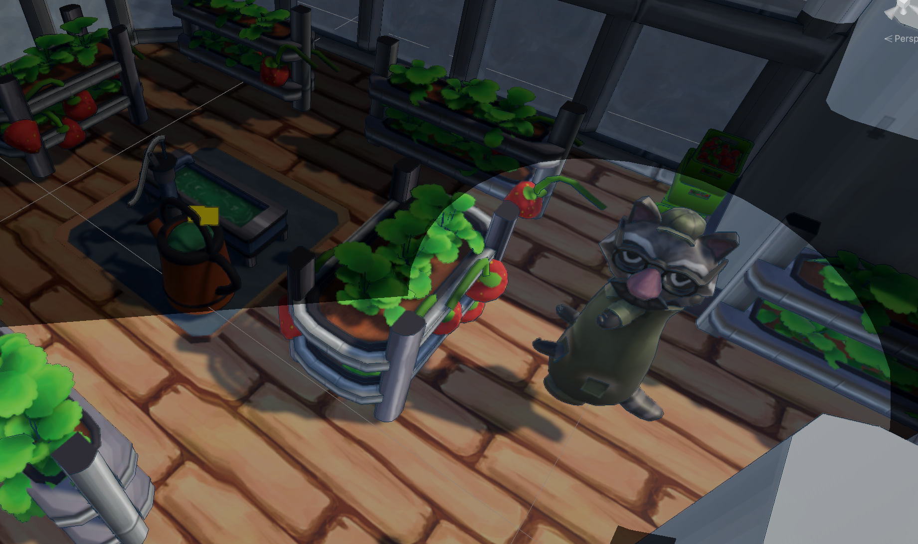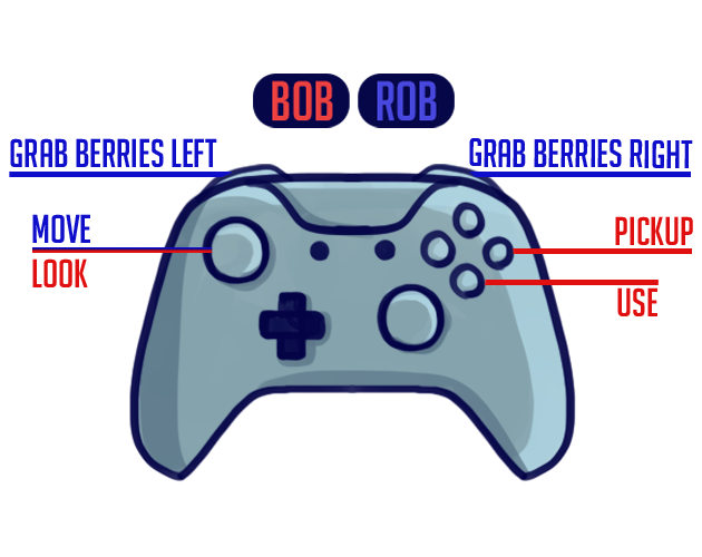 This is a 2-player co-op game where you are 2 raccoons stacked on top of each other, with a top-tier disguise. The top raccoon, Bob, will be in charge of looking out for the manager bots and completing tasks. The bottom raccoon, Rob, will be in charge of walking around and stealthily grabbing strawberries from the bushes to stash in their coat. Work together as a team to steal as many strawberries as possible before the work shift ends, AND MOST IMPORTANTLY, don't get caught!